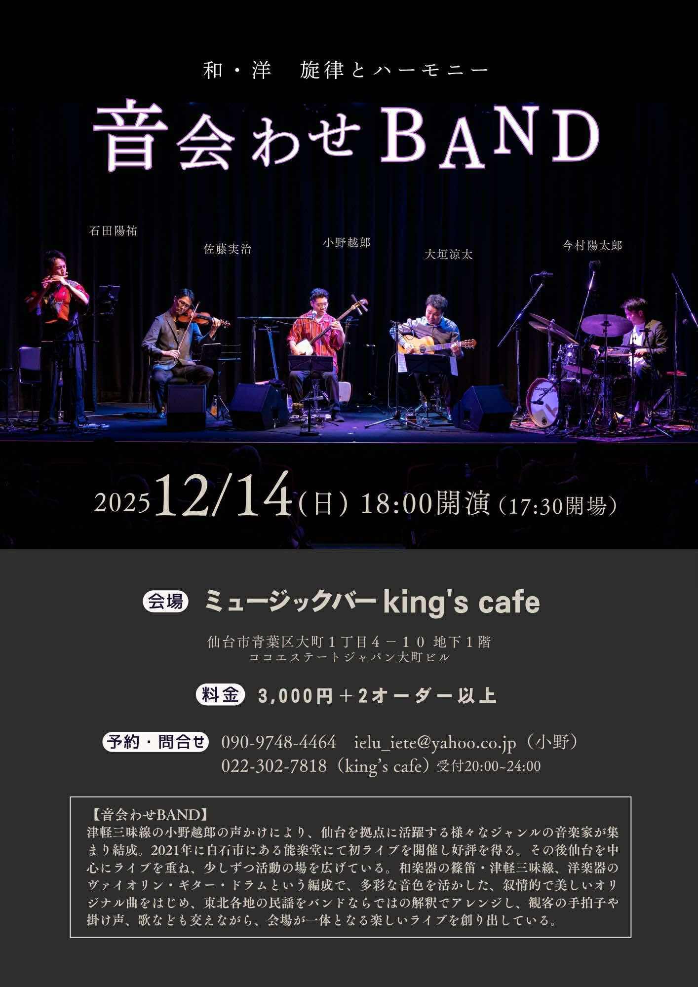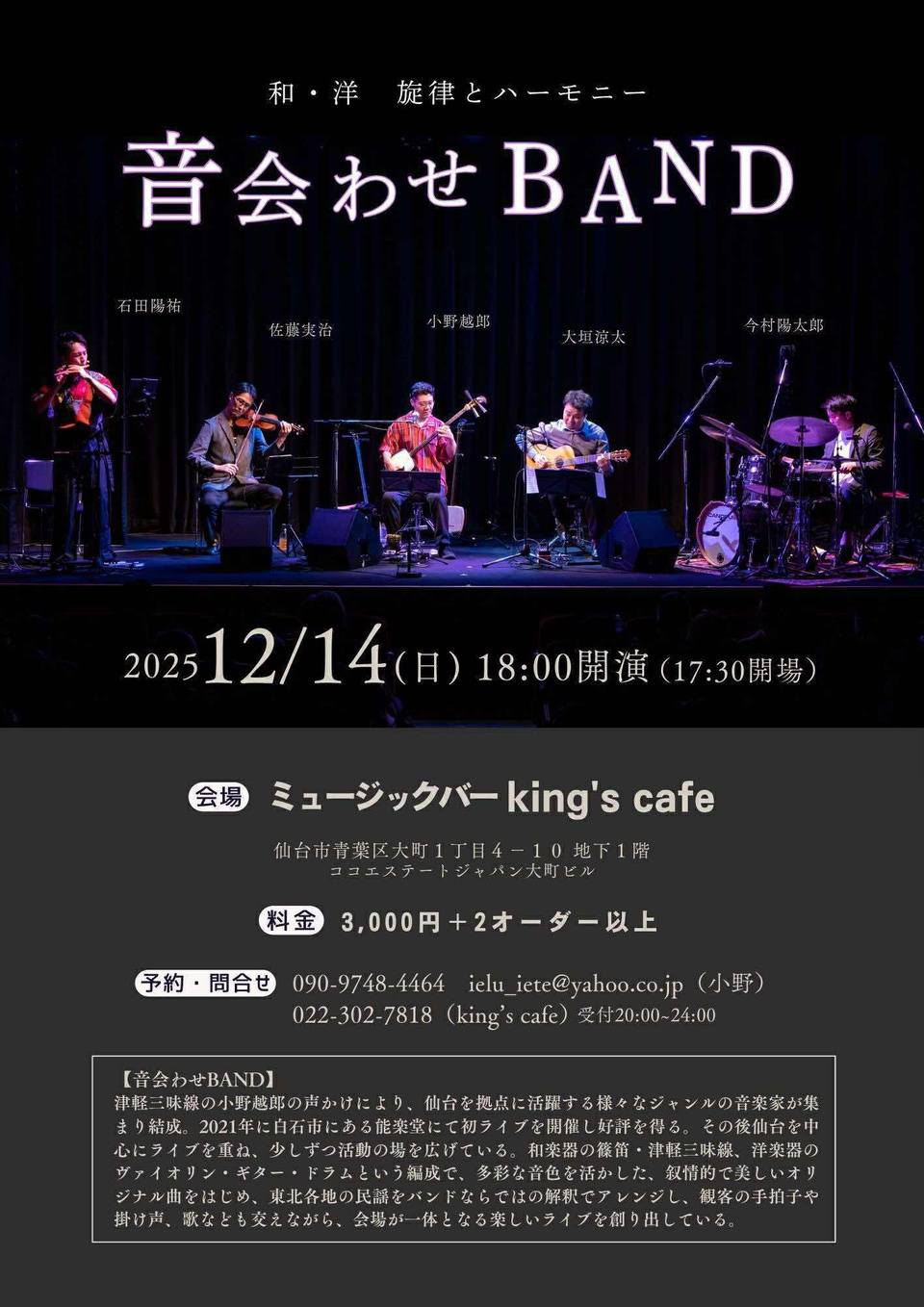 ■演奏 小野越郎(津軽三味線) 大垣涼太(ギター) 今村陽太郎(ドラム) 佐藤実治(ヴァイオリン) 石田陽祐(篠笛)